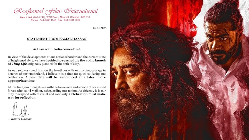 இதேபாணியில் வரும் 16-ந் தேதி நடைபெற இருந்த தக் லைப் படத்தின் இசை வெளியீட்டு விழா, ஒத்திவைக்கப்படுவதாக ராஜ்கமல் நிறுவனம் தெரிவித்துள்ளது. இதுதொடர்பாக கமல்ஹாசன் வெளியிட்டுள்ள அறிக்கையில், நாடு தான் முதன்மை, கலை காத்திருக்கட்டும் என்று கூறியுள்ளார். எல்லையில் ராணுவ வீரர்கள் தீரத்துடன் போரிட்டு வருகின்றனர், அவர்களது குடும்பத்தினர் கவலையுடன் காத்திருக்கின்றனர், இந்த நேரத்தில் பொழுதுபோக்கு சரியல்ல என்று கூறியுள்ளார். பின்னர் ஒரு தேதி குறிக்கப்பட்டு அப்போது இசை வெளியீட்டு விழா நடத்தப்படும் என்றும் கமல் அந்த அறிக்கையில் குறிப்பிட்டுள்ளார்.