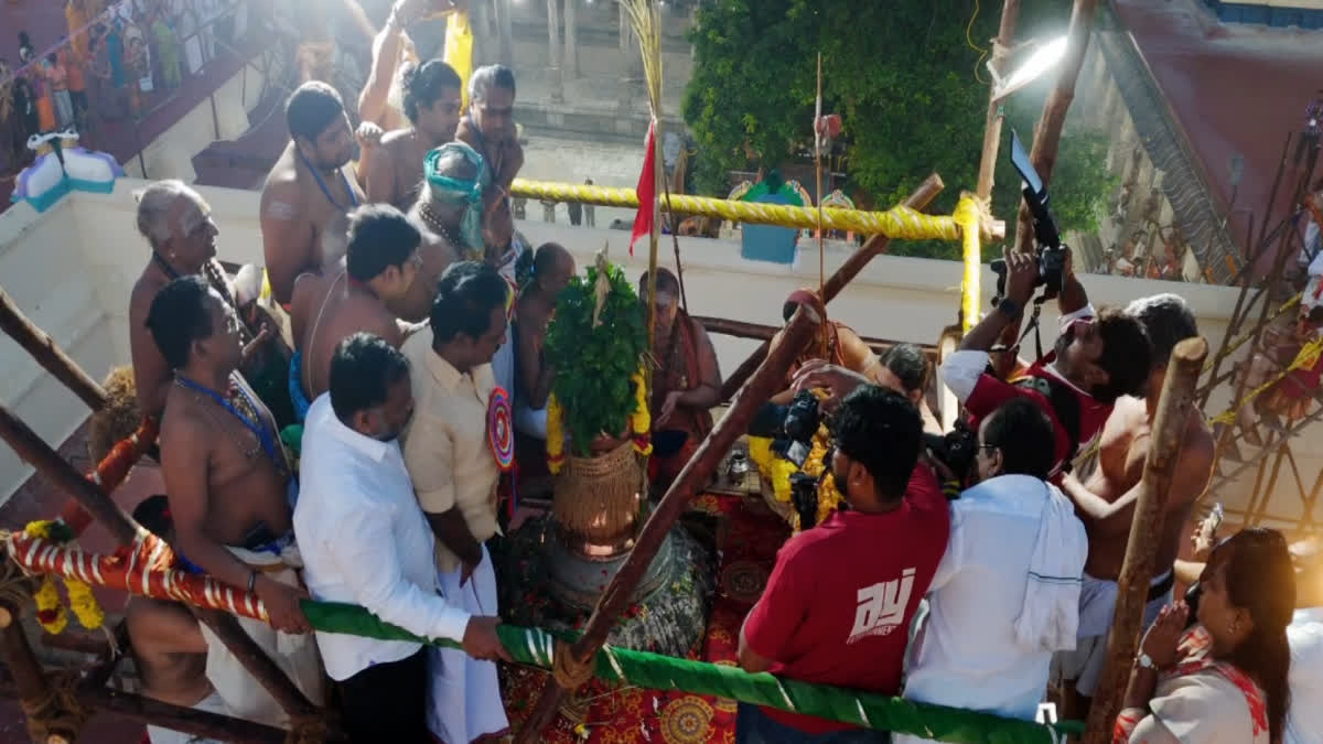 இன்று அதிகாலை 5:45 மணிக்கு பல்வேறு நதிகளில் இருந்து கொண்டு வரப்பட்ட புனித நீரை கோபுர கலசத்தில் ஊற்றி கும்பாபிஷேகம் வெகு விமர்சையாக நடைபெற்றது. 100க்கும் மேற்பட்ட சிவாச்சாரியார்கள் வேத மந்திரங்கள் முழங்க, மூன்று நாட்களாக யாக சாலையில் நடத்தி வந்த யாகங்கள் முடிவுற்ற நிலையில் மகாதீபாரதனை காண்பிக்கப்பட்டு, அதிகாலை 4:30 மணியளவில் புனித நீர் கலசத்தை ஊர்வலமாக கோபுரங்களுக்கு எடுத்து சென்றனர்.