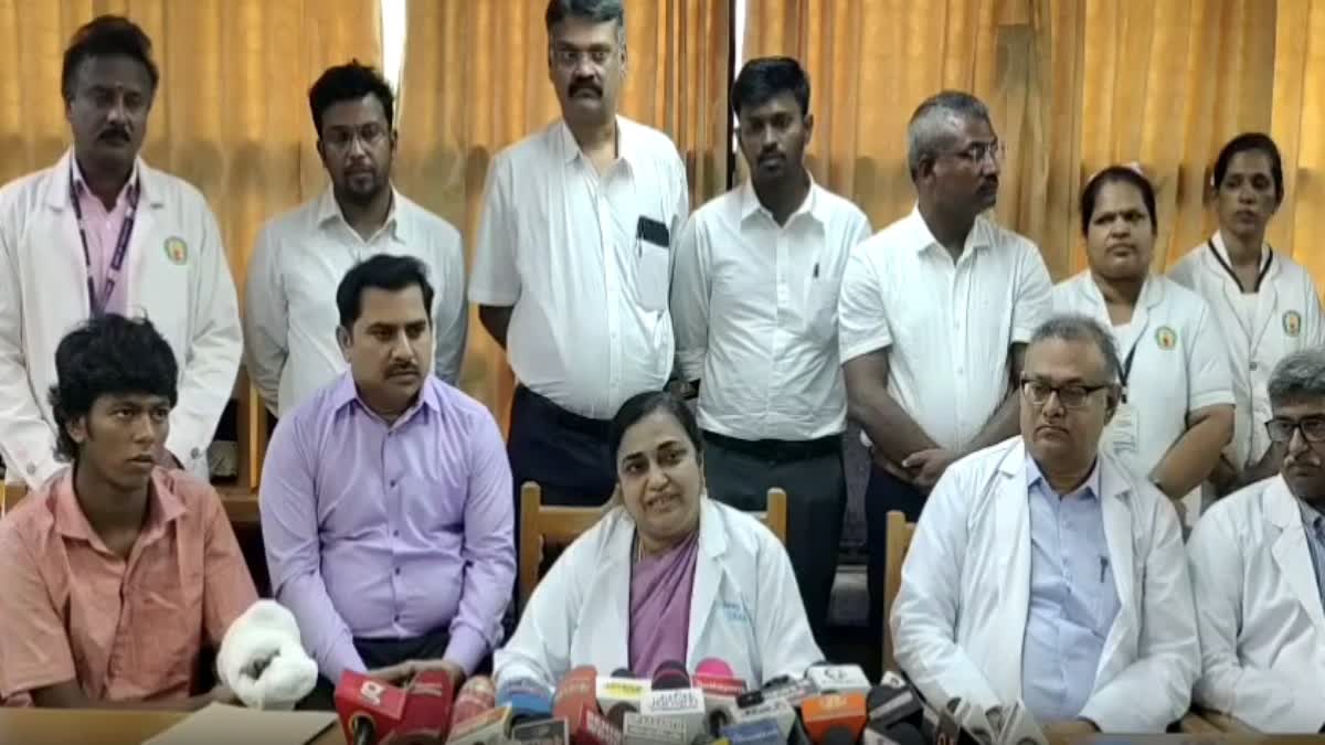 இது குறித்து நெல்லை அரசு மருத்துவக் கல்லூரி மருத்துவமனை முதல்வர் ரேவதி பாலன் செய்தியாளர்களை சந்தித்தார். அப்போது அவர் “திருநெல்வேலி மாவட்டம் களக்காடு அருகே உள்ள பத்மநேரி கிராமத்தைச் சேர்ந்தவர் பிச்சையா இசக்கி. இவருக்கு வயது 21. இவர் ஓட்டுநராக பணி செய்து வருகிறார். கடந்த ஆகஸ்ட் மாதம் ஐந்தாம் தேதி கோயில் திருவிழாவில் ஏற்பட்ட மோதலின் போது பிச்சையா இசக்கியின் இடது கை அரிவாளால் வெட்டப்பட்டு மணிகட்டு பகுதியில் இருந்து துண்டாகி விழுந்தது. படுகாயம் அடைந்த அவரை நெல்லை அரசு மருத்துவக் கல்லூரி மருத்துவமனைக்கு போலீசார் கொண்டு வந்து சேர்த்தனர்.