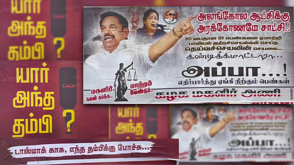 அரக்கோணம் சம்பவத்தையும் , டாஸ்மாக் வழக்கில் அரசியல் பின்னணியுடன் தலைமறைவாக உள்ளவர்களையும் மறைமுகமாக குறிப்பிட்டு அதிமுக சார்பில் சுவரொட்டி.