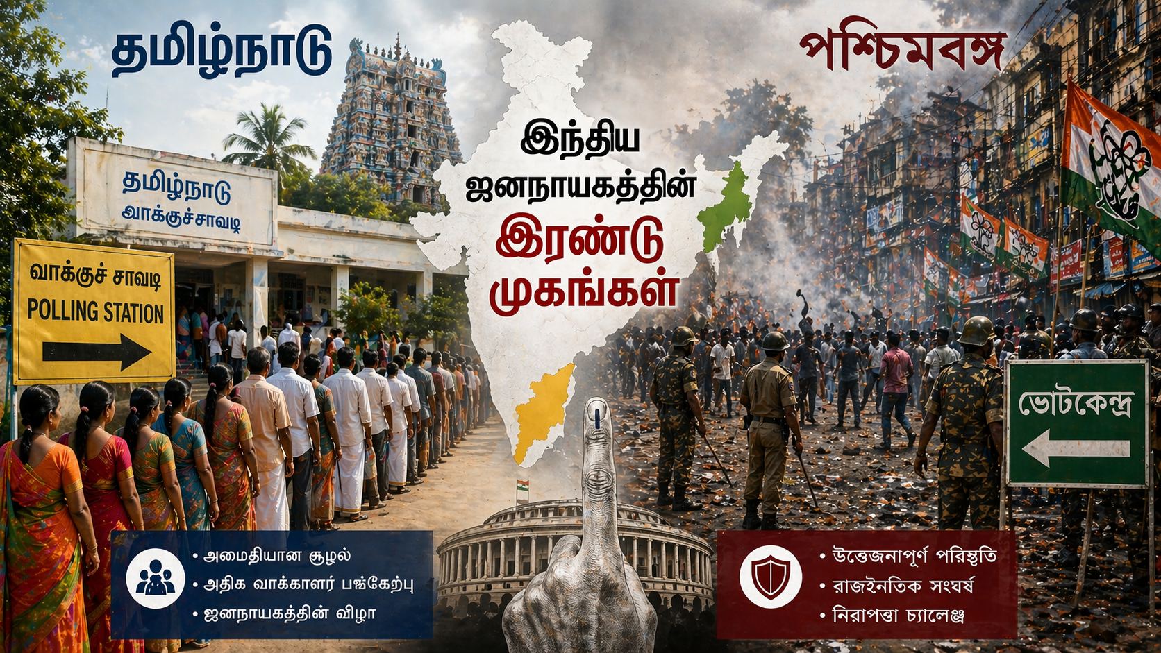 இந்தியாவில் தேர்தல் என்பது வெறும் அரசியல் நிகழ்வு அல்ல; அது ஜனநாயகத்தின் உயிரோட்டம். ஒவ்வொரு தேர்தலும் மக்கள் ஆட்சியின் அடிப்படை நம்பிக்கையை மீண்டும் உறுதிப்படுத்தும் தருணமாகும். ஆனால் இந்தியா போன்ற பரந்த சமூக-அரசியல் அமைப்பில், ஜனநாயகம் எல்லா மாநிலங்களிலும் ஒரே மாதிரி வெளிப்படுவதில்லை. ஒரே தேர்தல் முறையின் கீழ் கூட அரசியல் சூழல், தேர்தல் கலாச்சாரம், பாதுகாப்பு சூழ்நிலை போன்றவை மாநிலத்துக்கு மாநிலம் மாறுபடுகின்றன. தற்போது நடைபெறும் தமிழ்நாடு மற்றும் மேற்குவங்கம் தேர்தல்கள் இந்த வேறுபாட்டை தெளிவாகக் காட்டுகின்றன.