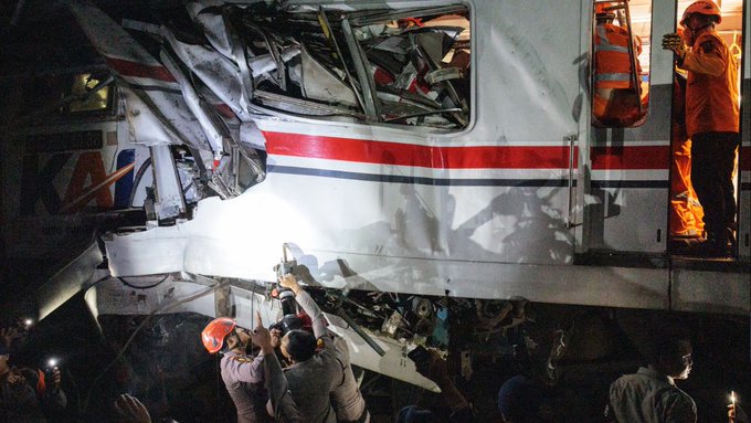 இந்தோனேசியாவின் பெகாசி திமூர் ரயில் நிலையத்தில் நடைமேடையில் நின்றிருந்த பயணிகள் ரயில் மீது மற்றொரு விரைவு ரயில் மோதி விபத்துக்குள்ளானது. இந்த கோர விபத்தில் 14 பேர் உயிரிழந்த நிலையில், 40 பேர் காயங்களுடன் மருத்துவமனையில் அனுமதிக்கப்பட்டுள்ளனர்.
