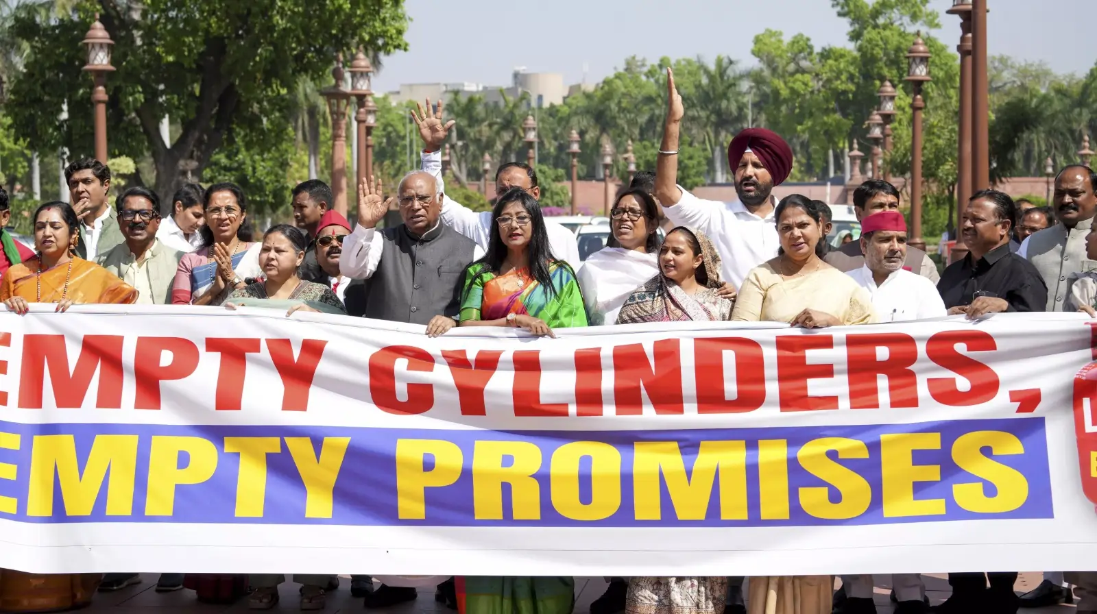 காங்கிரஸ் தலைவர் மற்றும் மாநிலங்களவை எதிர்க்கட்சித் தலைவர் மல்லிகார்ஜுன கார்கே தலைமையில், எதிர்க்கட்சி எம்பிக்கள் நாடாளுமன்ற வளாகத்தில் திரண்டு போராட்டத்தில் ஈடுபட்டனர். ,அப்போது மத்திய அரசின் தவறான வெளியுறவுக் கொள்கையே இந்தத் தட்டுப்பாட்டிற்குக் காரணம்” என முழக்கமிட்டனர். மேலும் பிரதமர் மோடியின் வெளியுறவுக் கொள்கை தோல்வியடைந்துவிட்டது, இதன் விளைவாகச் சாதாரண மக்கள் இன்று பட்டினியால் வாடுகின்றனர்” என்று கார்கே சாடினார்.