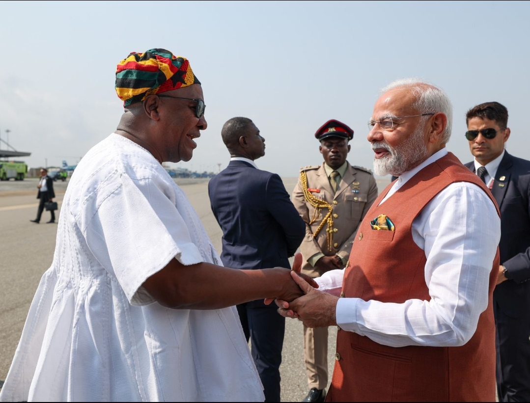 பிரதமர் நரேந்திர மோடி கானா தலைநகர் அக்ராவில் தரையிறங்கினார். அவரை கானா ஜனாதிபதி ஜான் டிராமானி மஹாமோ விமான நிலையத்திற்கே வந்து வரவேற்றார்.