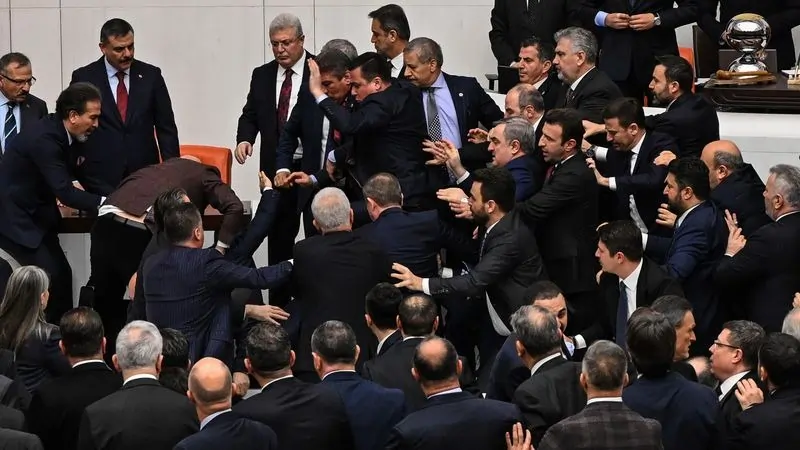 துருக்கிய நாடாளுமன்றத்தில் சட்டமன்ற உறுப்பினர்கள் ஒருவருக்கொருவர் மோதிக்கொண்டதால் பெரும் அமளி ஏற்பட்டது, ஜனாதிபதி ரெசெப் தையிப் எர்டோகனின் அமைச்சரவை மறுசீரமைப்பு தொடர்பாக ஆளும் கட்சியும் எதிர்க்கட்சியும் மோதிக்கொண்டன.
