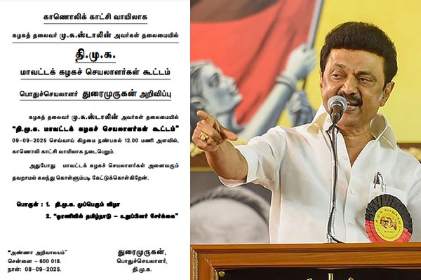 இது குறித்து திமுக பொதுச்செயலாளர் வெளியிட்டுள்ள அறிவிப்பில், “முதலமைச்சர் மு.க.ஸ்டாலின் தலைமையில் “திமுக மாவட்டச் செயலாளர்கள் கூட்டம்” 09-09-2025 செவ்வாய் கிழமை நண்பகல் 12.00 மணி அளவில், காணொலி காட்சி வாயிலாக நடைபெறும் என்று அறிவிக்கப்பட்டுள்ளது.