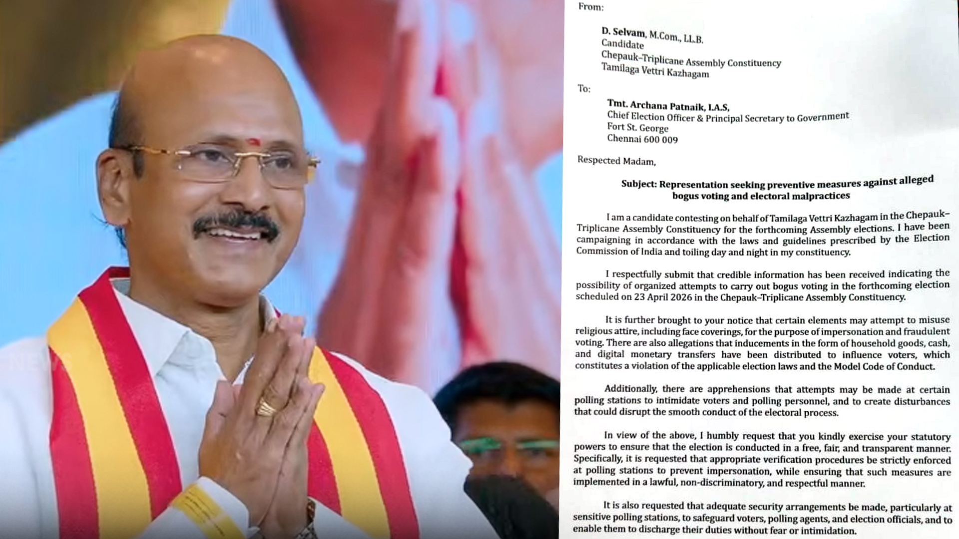 சேப்பாக்கம் – திருவல்லிக்கேணி சட்டமன்ற தொகுதியில் போலி வாக்குப்பதிவு மற்றும் தேர்தல் முறைகேடுகளை மேற்கொள்ள முயற்சிகள் நடப்பதாகவும், அதனைத் தடுக்க முன்னெச்சரிக்கை நடவடிக்கை எடுக்க வேண்டும் எனவும் தமிழக வெற்றிக் கழக வேட்பாளர்செல்வம், தலைமைத் தேர்தல் அதிகாரி அர்ச்சனா பட்நாயக்கிற்கு புகார் அளித்துள்ளார்.