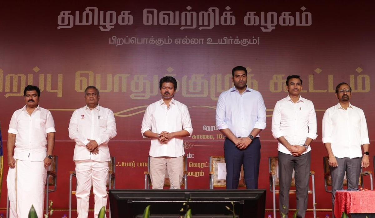 தமிழக வெற்றிக் கழகத்தின் சிறப்பு பொதுக்குழுக் கூட்டம் கட்சித் தலைவர் விஜய் தலைமையில் சென்னை அருகே மாமல்லபுரத்தில் இன்று காலை கூடியது. இதில், 12 தீர்மானங்கள் நிறைவேற்றப்பட்டன. முதல் தீர்மானத்தை கரூர் மேற்கு மாவட்டச் செயலாளர் வி.பி. மதியழகன் வாசித்தார். மேடைக்கு வந்த மதியழகனை விஜய் கட்டியணைத்து வாழ்த்து தெரிவித்தார். “தமிழகத்தில் புதிய மற்றும் நேர்மையான அரசியல் அதிகார மாற்றத்தை ஏற்படுத்தும் உன்னத லட்சிய நோக்கத்தின் செயல்வடிவத்தின் முதல்படியாக நம் தலைவர் விஜய், மக்கள் சந்திப்புப் பயணத்தை தொடங்கினார். திருச்சி, அரியலூர், நாகப்பட்டினம், திருவாரூர் ஆகிய ஊர்களில் நம் தலைவரின் அனல் பறக்கும் பேச்சும் ஆளும் தரப்பை நோக்கிய கேள்விகளும் தமிழக அரசியலில் அதிர்வலைகளை ஏற்படுத்தின.
