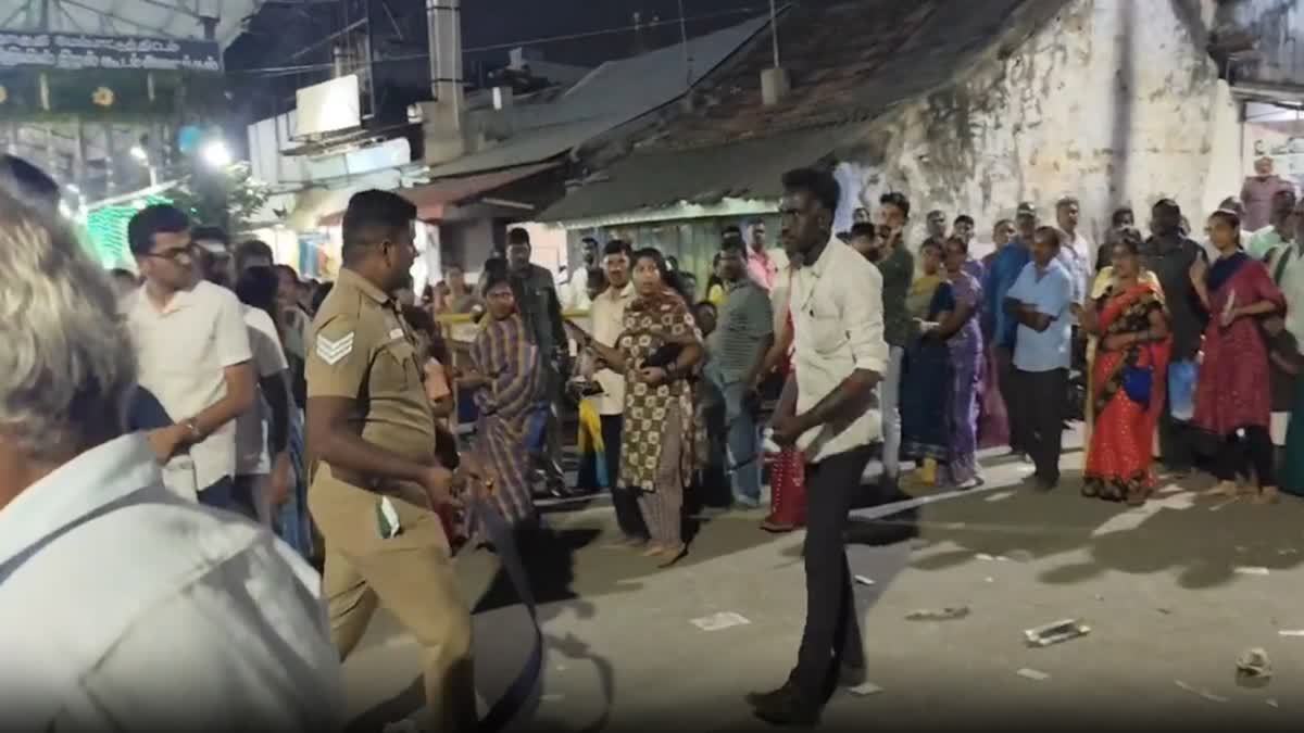 இதனால் கோபம் அடைந்த அந்த இளைஞர் திடீரென தான் மறைத்து வைத்திருந்த கத்தியை எடுத்துக் கொண்டு தலைமை காவலரை தாக்க முயன்றார். மேலும் தலைமை காவலரை தகாத வார்த்தைகளால் திட்டிக் கொண்டு, அவரை குத்துவதற்காக பாய்ந்ததால் கோயிலில் சாமி தரிசனம் செய்ய காத்திருந்த பக்தர்கள் மற்றும் குழந்தைகள் அதிர்ச்சியடைந்து அங்கும் இங்கும் நாலாபுறமும் ஓடினர்.