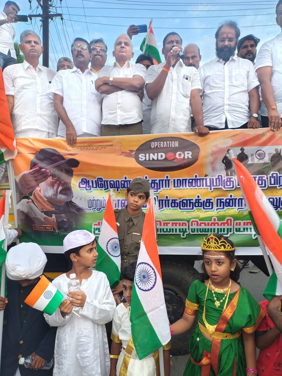 ஆப்ரேஷன் சிந்தூர் உலக நாடுகளுக்கு இந்தியா பயங்கரவாதத்தை எப்படி ? எதிர்கொண்டு இருக்கிறது என்பதற்கு உதாரணமாக இருக்கிறது. இந்த ஆபரேஷன் சிந்தூர் மூவர்ண கொடி யாத்திரை, நாடு முழுவதும் நடந்து கொண்டு இருக்கிறது. ஆப்ரேஷன் சிந்தூர் என அழகான பெயரிட்டு இருக்கிறார் மோடி.” எனக் கூறினார்.