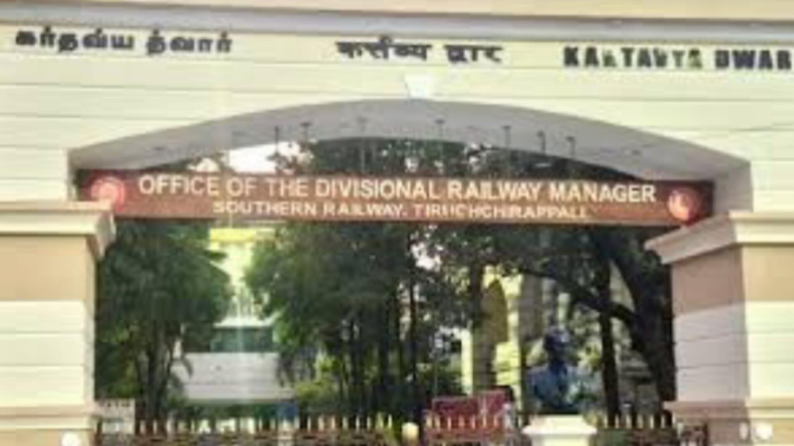 திருச்சி ரெயில்வே கோட்ட மேலாளர் அலுவலகம் திருச்சி ஜங்சன் ரயில் நிலையம் அருகே அமைந்துள்ளது. அந்த ரயில் நுழைவு வளைவு புதிதாக கட்டப்பட்டுள்ளது. இதில், அலுவலக வாயில் என்பதை இந்தி வார்த்தையில் “கர்தவ்ய த்வார்” குறிப்பிடுகின்றனர். இதனை, கர்தவ்ய த்வார் என தமிழ் எழுத்துக்களைக் கொண்டும், KARTAVYA DWAR என்ற ஆங்கில எழுத்துக்களைக் கொண்டும் எழுதியுள்ளனர்.