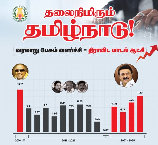 இதற்கு முன்பு, இரட்டை இலக்க வளர்ச்சி எட்டப்பட்டது 2010-11-ஆம் ஆண்டில். அப்போது கலைஞர் ஆட்சி! இப்போது கலைஞர் வழி நடக்கும் திராவிட மாடல் ஆட்சி! இரண்டுமே கழக ஆட்சி! 2030-ஆம் ஆண்டுக்குள் #OneTrillionDollar பொருளாதாரம் என்றபோது பலரது புருவமும் உயர்ந்தது. “இது மிக உயர்ந்த இலக்கு, எப்படி சாத்தியமாகும்?” என்றார்கள்! இதே வேகத்தில் சென்றால், எதுவும் சாத்தியம் என்பது இப்போது மெய்ப்பிக்கப்பட்டுவிட்டது!.