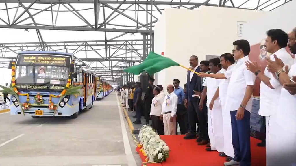 திருச்சி மாவட்டம் பஞ்சப்பூரில் 408 கோடி ரூபாய் மதிப்பீட்டில் பல்வேறு வசதிகளுடன் கட்டப்பட்டுள்ள ஒருங்கிணைந்த பேருந்து நிலையத்தை முதலமைச்சர் மு.க.ஸ்டாலின் இன்று (9/5/2025) திறந்து வைத்தார். மேலும் 50 ஆயிரம் பேருக்கு இலவச வீட்டு மனைப்பட்டாவையும் அவர் வழங்கினார். இதுமட்டுமல்லாது 464 கோடி ரூபாய் மதிப்பில் நிறைவுபெற்ற பல்வேறு திட்டப்பணிகளை அவர் தொடங்கி வைத்தார். கூடவே, 830 கோடி ரூபாய் மதிப்பிலான அரசு நலத்திட்ட உதவிகளையும் முதலமைச்சர் மு.க.ஸ்டாலின் பயனாளிகளுக்கு வழங்கினார்.