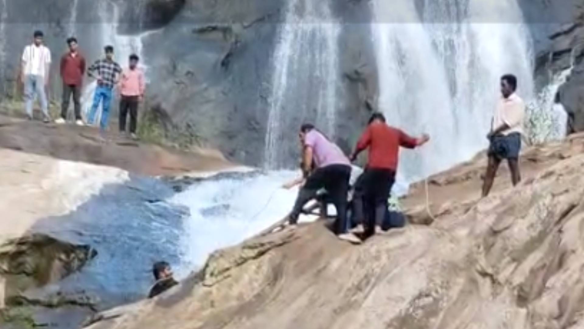 அதில் ஒருவர் கால் வழுக்கி அருவி நீர் வழிந்து செல்லும் பாறையை பிடித்தவாறு தொங்கிய நிலையில் இருந்துள்ளார்.