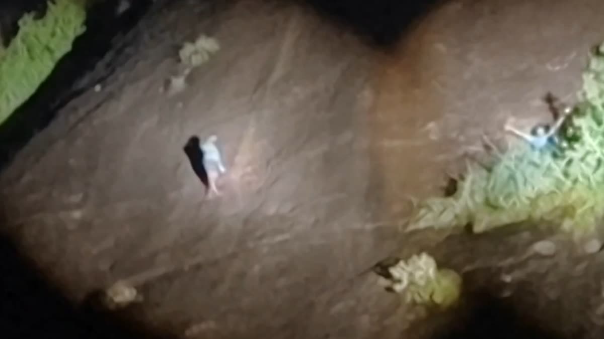 இரவு நேரத்தில் பலத்த மழை பெய்துகொண்டிருந்த போதும், சக்திவாய்ந்த லேசர் விளக்குகளுடன் போலீசார் மலைப்பகுதியில் ஏறித் தேடினர். அப்போது, பாறையின் செங்குத்தான பகுதியில் ஏறிய 5 காவலர்கள் மீண்டும் கீழே இறங்க முடியாமல் சிக்கிக் கொண்டனர். பொத்தையின் நடுப்பகுதியில் அவர்கள் தொங்கிக் கொண்டிருந்ததால் அவர்களால் கீழே வர முடியவில்லை.