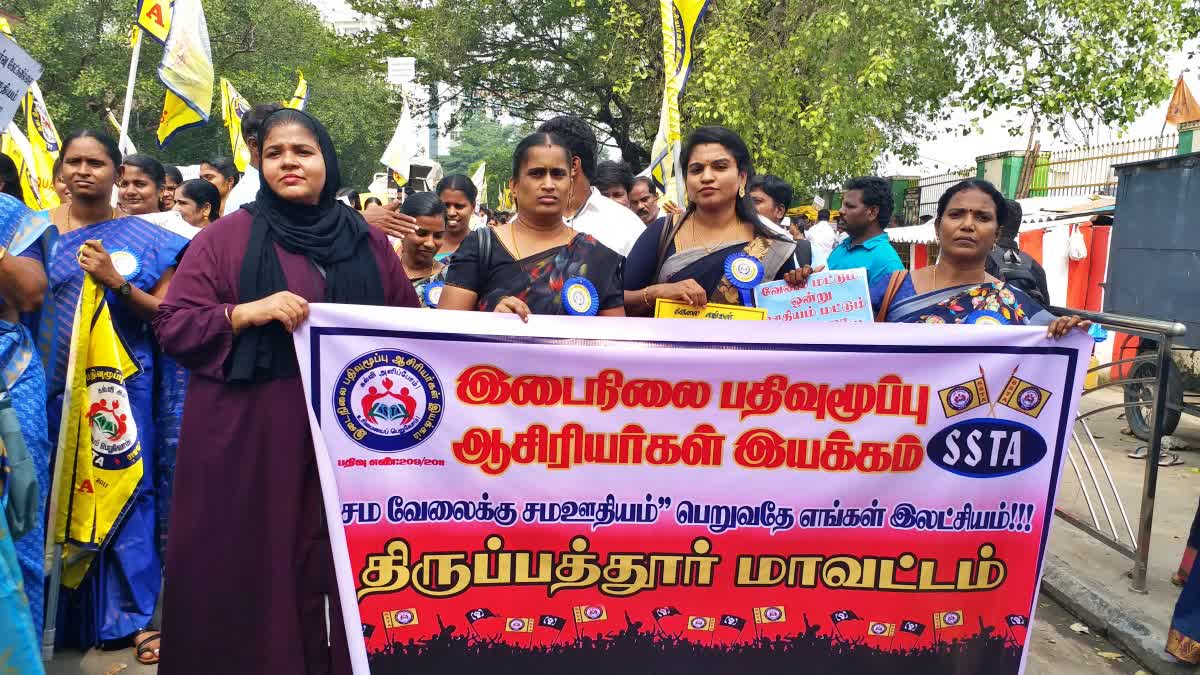 ‘சம வேலைக்கு சம ஊதியம்’ என்ற ஒற்றை வாக்குறுதியை வலியுறுத்தி, இடைநிலை பதிவு மூப்பு ஆசிரியர்கள் இயக்கம் சார்பில் 2 ஆயிரத்திற்கும் மேற்பட்ட ஆசிரியர்கள் சென்னை எழும்பூர் லாங்ஸ் தோட்ட சாலையில் இருந்து ராஜரத்தினம் மைதானம் வரை பேரணியாக சென்றனர்.
