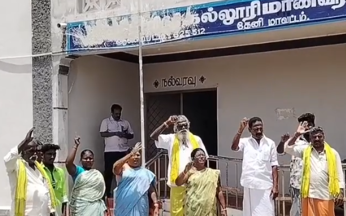 தமிழகத்தில் உள்ள கள்ளர் சீரமைப்பு பள்ளிகள் மற்றும் கள்ளர் மாணவ மாணவி விடுதிகளில் பெயரை சமூக நீதி என்ற பெயர் மாற்றத்திற்கு உத்தரவிட்ட தமிழக அரசைக் கண்டித்து தேனி மாவட்டம் ஆண்டிப்பட்டி அருகே சக்கம்பட்டி பகுதியில் செயல்படும் கள்ளர் சீரமைப்பு மாணவர் விடுதிக்கு சென்ற DNT மக்கள் முன்னேற்ற கழகம், அகில இந்திய பார்வர்டு பிளாக் உள்ளிட்ட அமைப்புகளை சேர்ந்த கள்ளர் சமூகத்தினர்.